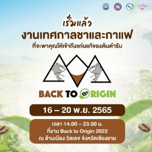 การท่องเที่ยวแห่งประเทศไทย (ททท.) ร่วมกับจังหวัดเชียงราย จัดกิจกรรม “Back to Origin 2022”ในวันที่ 16-20 พฤศจิกายน 2565 เวลา 16.00-22.00 น. ณ ล้านเมืองวิลเลจ อำเภอเมือง จังหวัดเชียงราย ตอบรับกระแสนิยมการบริโภคชา-กาแฟของคนไทย และให้เป็นกิจกรรมที่จะกระตุ้นการเดินทางของนักท่องเที่ยว และกระจายรายได้ทางการท่องเที่ยวเข้าสู่จังหวัดเชียงราย พร้อมทั้งประชาสัมพันธ์และสร้างการรับรู้ถึงสินค้าทางการท่องเที่ยวของจังหวัดเชียงราย (กาแฟสายพันธุ์อาราบิก้า และชา) และเส้นทางท่องเที่ยวเชิงเกษตรของชุมชน อีกทั้งยังเป็นการเพิ่มช่องทางการจำหน่ายสินค้าให้กับเกษตรกร และผู้ประกอบการธุรกิจด้านชา-กาแฟ อันจะเป็นการกระตุ้นเศรษฐกิจของพื้นที่จังหวัดเชียงราย หลังจากสถานการณ์การแพร่ระบาดของเชื้อไวรัสโควิด 19 เริ่มคลี่คลายลง