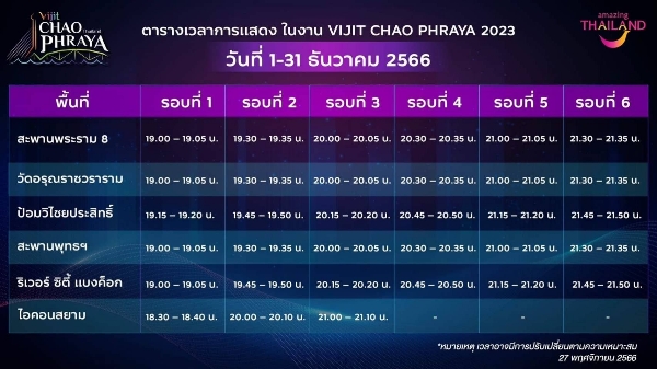 ตระการตากับการแสดงมากมาย บริเวณริมแม่น้ำเจ้าพระยา ตลอดทั้งเดือนธันวาคม ใน 7 พื้นที่หลัก ประกอบด้วย