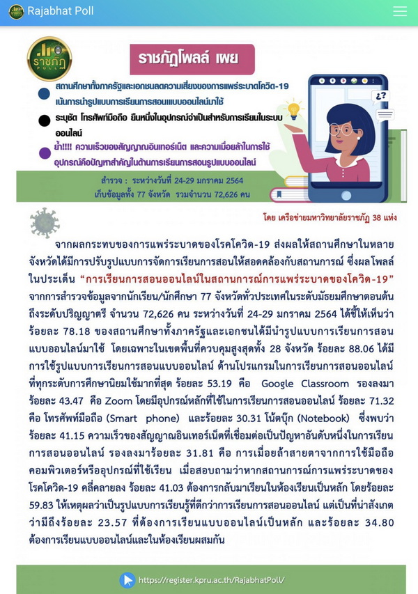 เครือข่ายมหาวิทยาลัยราชภัฏ 38 แห่ง เผยการสำรวจความคิดเห็นต่อสถานการณ์การแพร่ระบาดของโรคโควิด-19 หัวข้อ “การเรียนการสอนออนไลน์ในสถานการณ์การแพร่ระบาดของโรคโควิด-19” โดยเก็บข้อมูลนักเรียน นักศึกษา ระดับมัธยมศึกษาถึงปริญญาตรี จำนวน 72,626 คน ระหว่างวันที่ 24 – 29 มกราคม 2564 พบว่า สถานศึกษาทั้งภาครัฐและเอกชนจัดการเรียนการสอนในรูปแบบออนไลน์ 78.18% โดยเฉพาะในเขตควบคุมสูงสุด 28 จังหวัด มีการเรียนกรสอนแบบออนไลน์ 88.06%