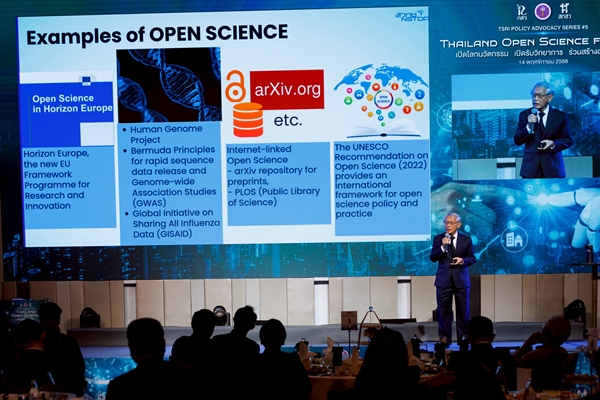 สำหรับการเสวนาแลกเปลี่ยนความคิดเห็นในหัวข้อ “Open Science in Action: ก้าวสู่อนาคตไทย” ประกอบด้วย คุณนครินทร์ วนกิจไพบูลย์-ประธานเจ้าหน้าที่บริหารและบรรณาธิการบริหาร บริษัท เดอะสแตนดาร์ด จำกัด, คุณเพ็ญโฉม แซ่ตั้ง-อำนวยการมูลนิธิบูรณะนิเวศ, ศ.ดร.ณรงค์ฤทธิ์ สมบัติสมภพ-ผู้พัฒนาระบบฐานข้อมูลวารสารไทย, ศ.ดร.ยศชนัน วงศ์สวัสดิ์ กรรมการ National Al Committee และ ศ.ดร.ธีรณี อจลากุล ผู้อำนวยการสถาบันข้อมูลขนาดใหญ่ (องค์การมหาชน) ผู้ร่วมเสวนาต่างมองว่าองค์ความรู้ทางวิทยาศาสตร์และงานวิจัยมีอยู่มากในประเทศไทย โจทย์คือการสร้างความต้องการในการบริโภคข้อมูลวิทยาศาสตร์และวิทยาการแบบเปิด จึงควรมีแพลตฟอร์ม Thailand Open Science for All ที่ทั้งประชาชนทั่วไป สื่อมวลชน สามารถเข้าถึงข้อมูลงานวิจัยได้ง่ายขึ้น