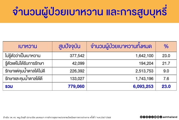 หมอเตือน คนไทยป่วยเบาหวานที่สูบบุหรี่มีมากกว่า 7 แสนคน เกือบครึ่งไม่รู้ตัวว่าป่วย