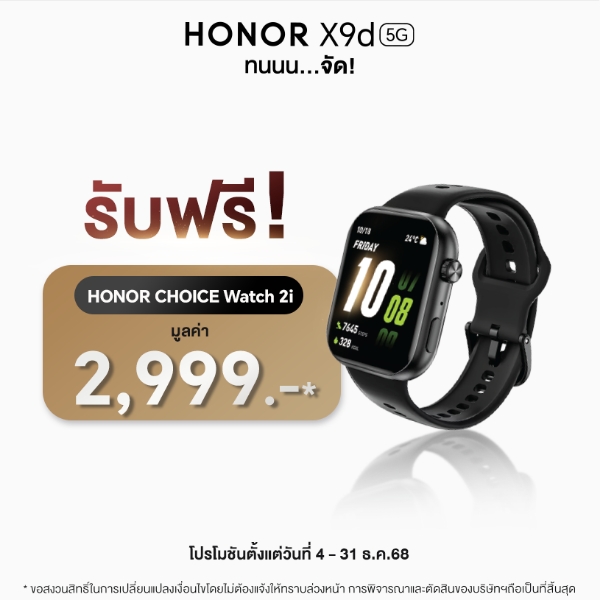 HONOR X9d 5G วางจำหน่ายในประเทศไทยกับความจุเดียว 12GB + 256GB พร้อม 3 เฉดสีพรีเมียม ได้แก่ Reddish Brown (สีน้ำตาลแดง), Sunrise Gold (สีทองประกาย) และ Midnight Black (สีดำยามค่ำคืน) ในราคาคุ้มค่า 11,990 บาท มาพร้อมโปรสุดคุ้ม 3 ต่อ โดยต่อที่ 1 รับฟรี! HONOR Choice Watch 2i มูลค่ารวม 2,999 บาท ต่อที่ 2 อุ่นใจด้วยประกันจัดเต็มด้วยประกันศูนย์นาน 2 ปี รับประกันหน้าจอแตก 2 ปี เปลี่ยนเครื่องได้ 2 ครั้ง และประกันแบตเตอรี่ระยะเวลา 2 ปี เปลี่ยนแบตเตอรี่ได้ 1 ครั้ง เมื่อประสิทธิภาพแบตเตอรี่ต่ำกว่า 80% และต่อที่ 3 พิเศษสุด! รับสิทธิ์เป็นผู้โชคดีรับรางวัลใหญ่รถ Mercedes-Benz C 350e AMG Dynamic จำนวน 1 รางวัล หรือ ทองคำหนัก 2 สลึง จำนวน 10 รางวัล โปรโมชั่นและสิทธิ์ลุ้นรางวัลใหญ่ เปิดให้ร่วมตั้งแต่วันที่ 4 ธันวาคม 2568 ถึง