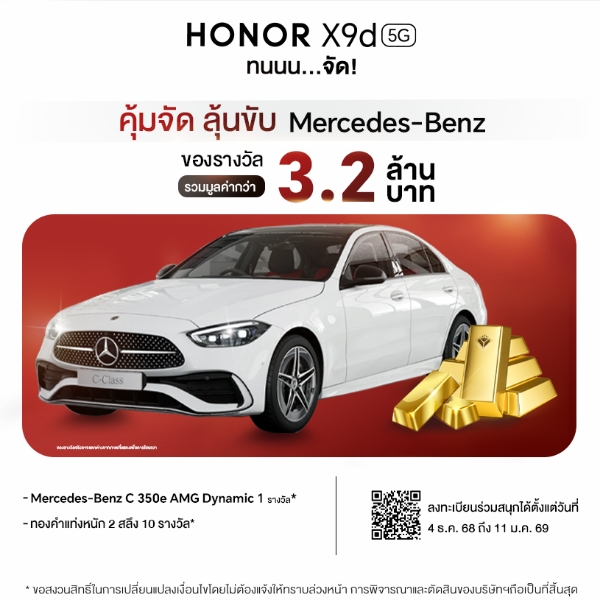 HONOR เปิดตัว ‘HONOR X9d 5G’ สมาร์ตโฟนสุดแกร่ง แบตฯ ใหญ่สุดในตลาดเริ่มวางขาย 4 ธ.ค.68 เป็นต้นไป คุ้มค่าในราคา 11,990 บาท พร้อมตอบแทนลูกค้าส่งท้ายปี! มอบสิทธิ์เป็นผู้โชคดีรับ Mercedes-Benz C 350e AMG Dynamic